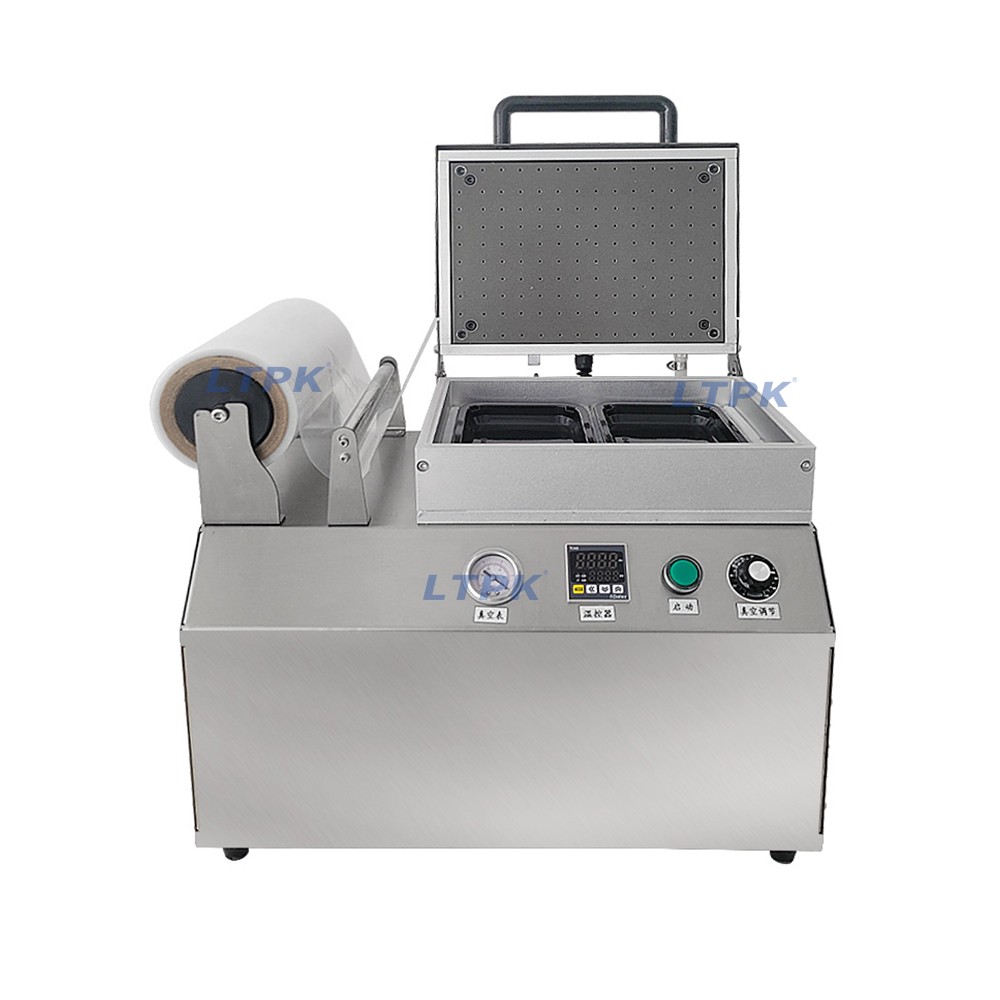 This equipment is a packaging machine specially designed for vacuum fitting of food boxes. It is mainly composed of chassis, film release mechanism (composed of film rack, film rolling roller and film walking roller), upper and lower vacuum chambers, molds, heating and temperature control system and electrical automatic control system.